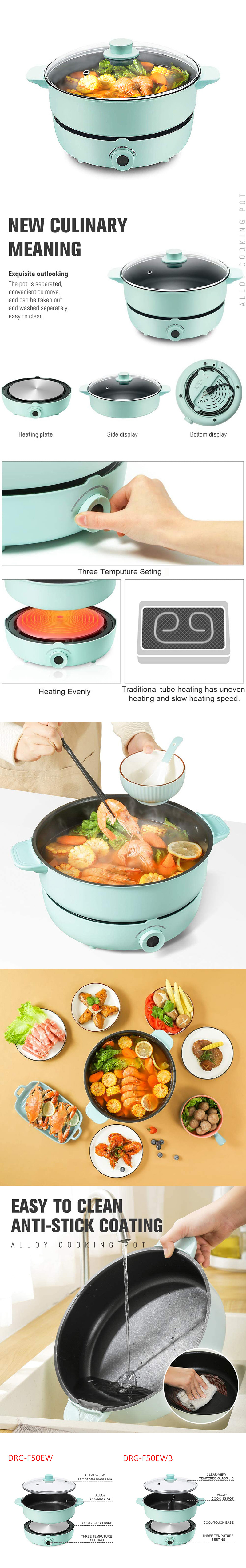 高效加热:电火锅配有高效加热管,加热快速均匀。由于过热保护技术,当炉板温度高于设定数据时,电器将无法工作。注意: 当温度低于设定数据时,炉子将继续工作。